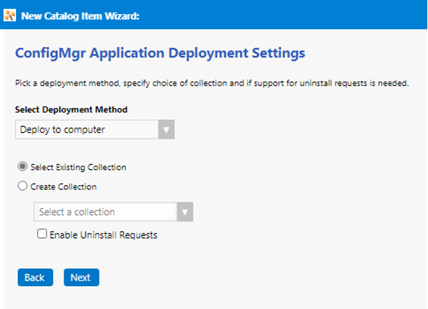 | Create Uninstall Collection | Select this option to add an uninstall collection to this catalog item. When this option is selected, users will be able to submit an uninstall request from App Portal, and System Center Configuration Manager will uninstall the application. App Portal will inform the user when the uninstall is complete. |