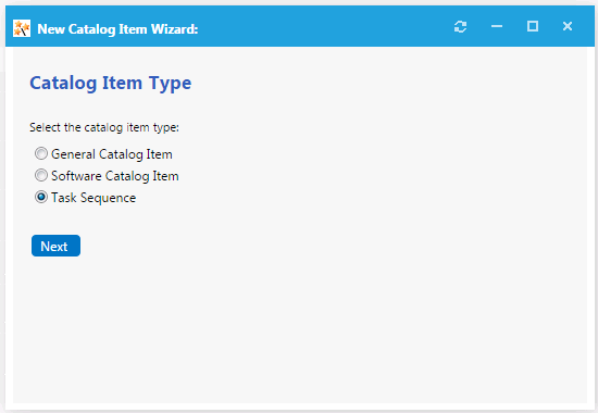 Under Catalog Management, select New Catalog Item Wizard. The Catalog Item Type panel of the New Catalog Item Wizard opens.