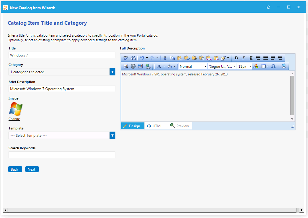 Title—The text entered in the Title field along with the catalog item icon, will be displayed when viewing this catalog item on the Browse Catalog tab.