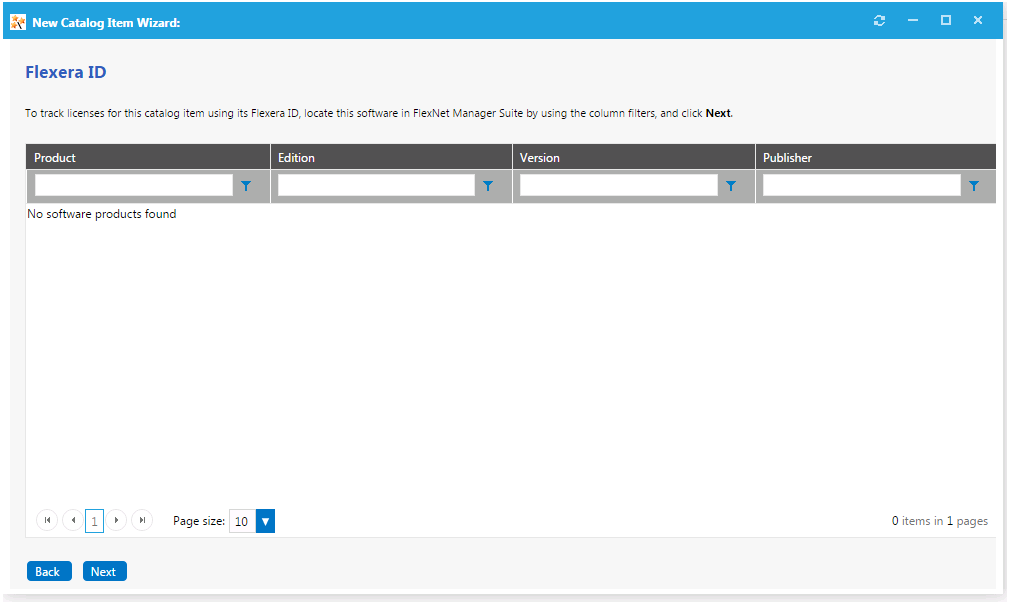 When you are finished editing the fields on the Catalog Item Title and Category panel, click Next. If you are connected to FlexNet Manager Enterprise Suite, the Flexera ID panel opens.