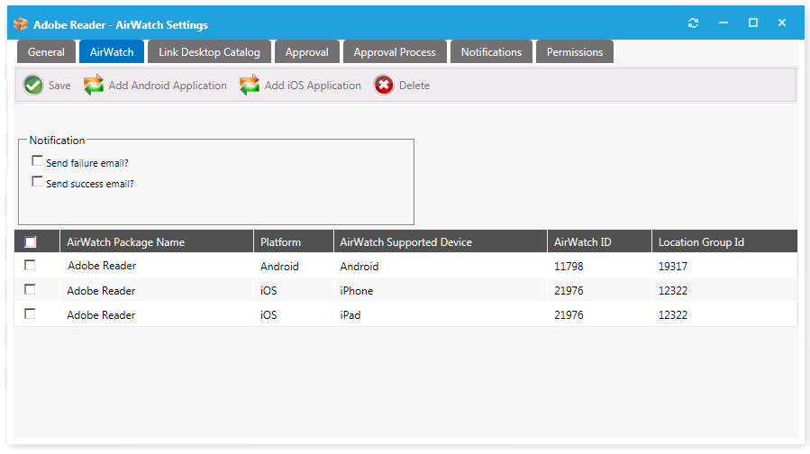 Property Description Workspace ONE UEM Package Name Name of package on the Workspace ONE UEM instance. Platform Identifies the platform of the mobile application to be either iOS or Android. Workspace ONE UEM Supported Device Identifies the supported device of the mobile application: either iPad or iPhone for iOS, or Android for Android . Workspace ONE UEM ID Number identifying the application on the Workspace ONE UEM server. Location Group Id Number identifying the Active Directory location group that was specified for this mobile application when it was added to Workspace ONE UEM. Only users within the mobile application’s same location group hierarchy will have access to that mobile application. -