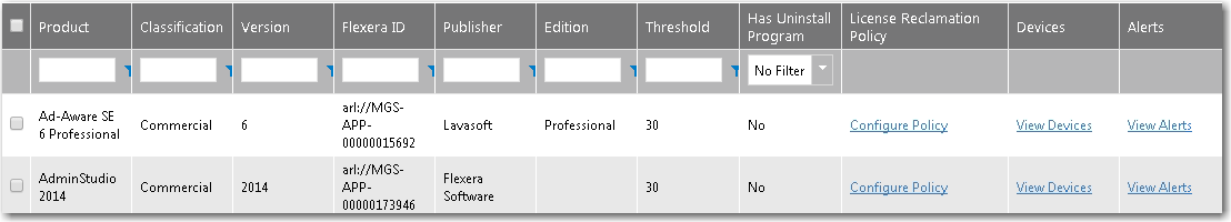 5. Optionally, click Configure Policy in the License Reclamation Policy column to set policy options for this application such as the license reclamation threshold and whether to automatically uninstall this application. See Configure License Reclamation Policy for more information.